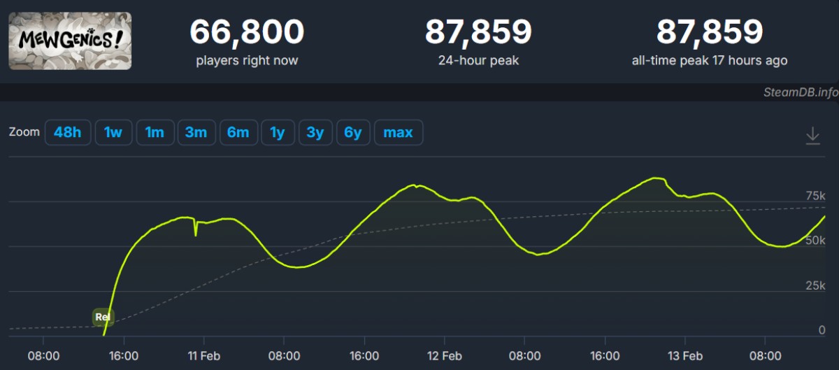 In the first few hours, Mewgenics attracted over 60,000 concurrent users (CCU) on Steam. In the following days, the numbers continued to grow, reaching 87,859 CCU by February 13th. This is significantly higher than any other project by McMillen or Glaiel, including The Binding of Isaac: Rebirth (70.7 thousand CCU).