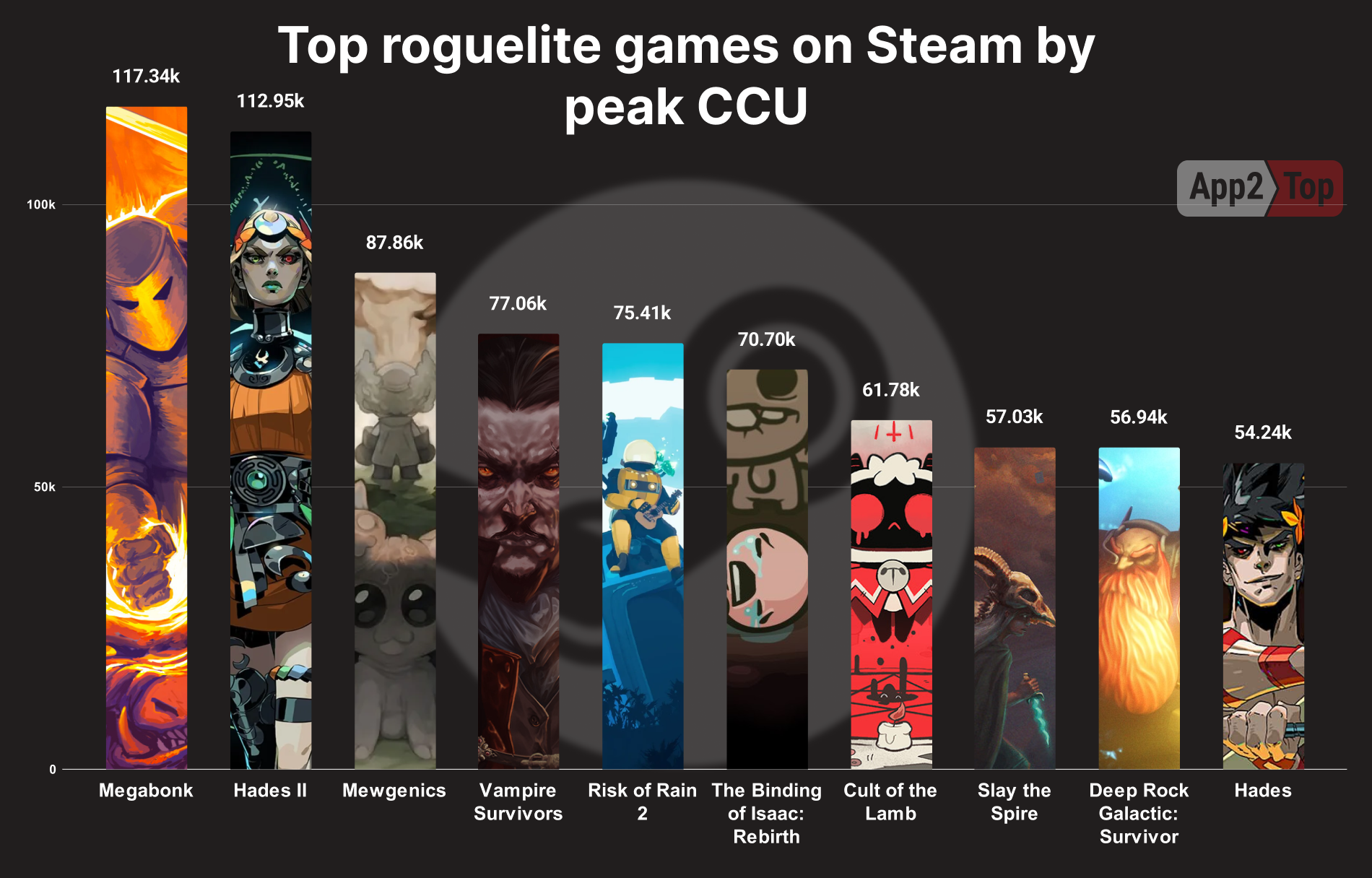 McMillen and Glaiel’s new project has shown an impressive start for its genre. Let's first look at the peak online metrics of other "roguelikes."
